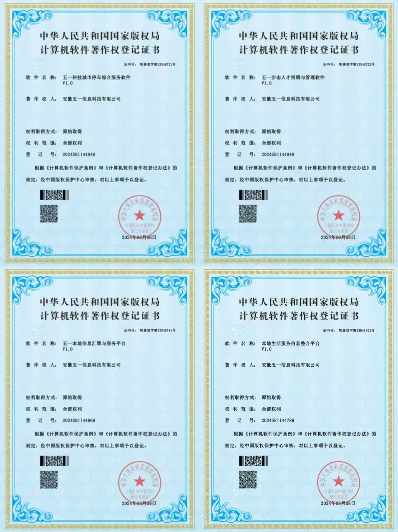 2024年8月8日,获得了五一科技城市停车综合服务软件,体现了它在停车系统开发的实力。