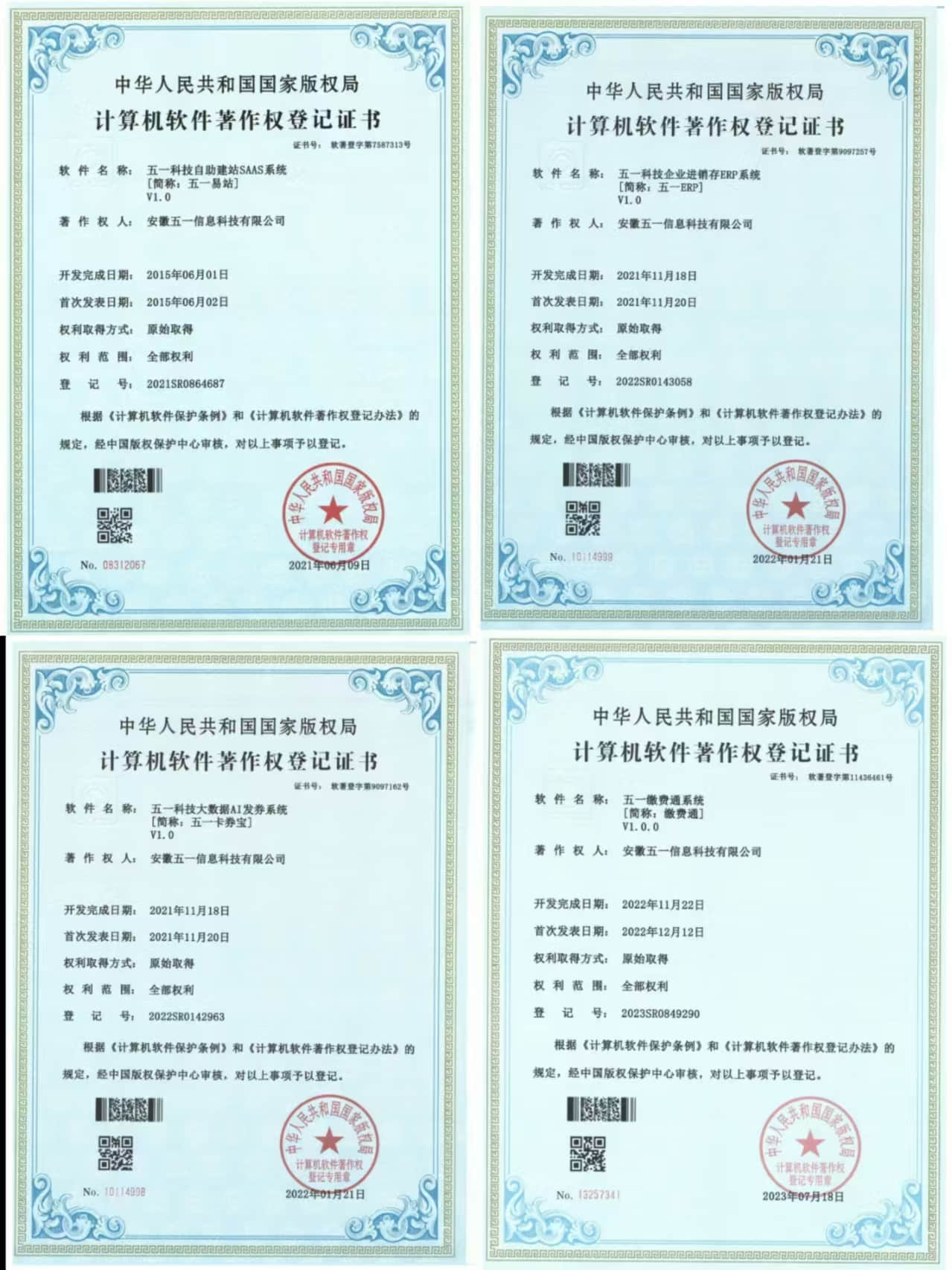 2021年6月9日,获得了五一科技自助建站SAAS系统【简称:五一易站】,彰显了其强大的软件开发能力。