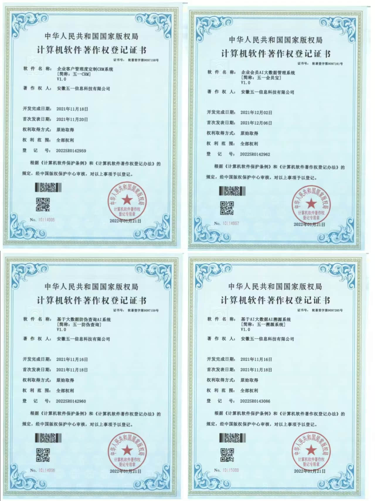 2022年1月21日,获得了企业客户管理度定制CRM系统【简称:五一CRM】,证明了其在客户管理系统开发的实力。
