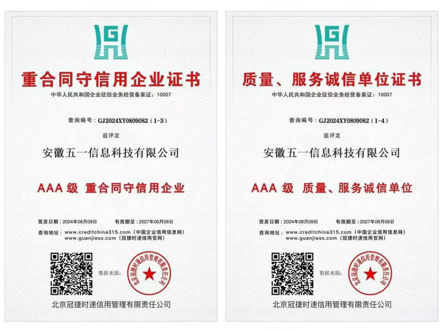2024年8月9日,安徽五一信息科技有限公司获得AAA级 质量、服务诚信单位证书。