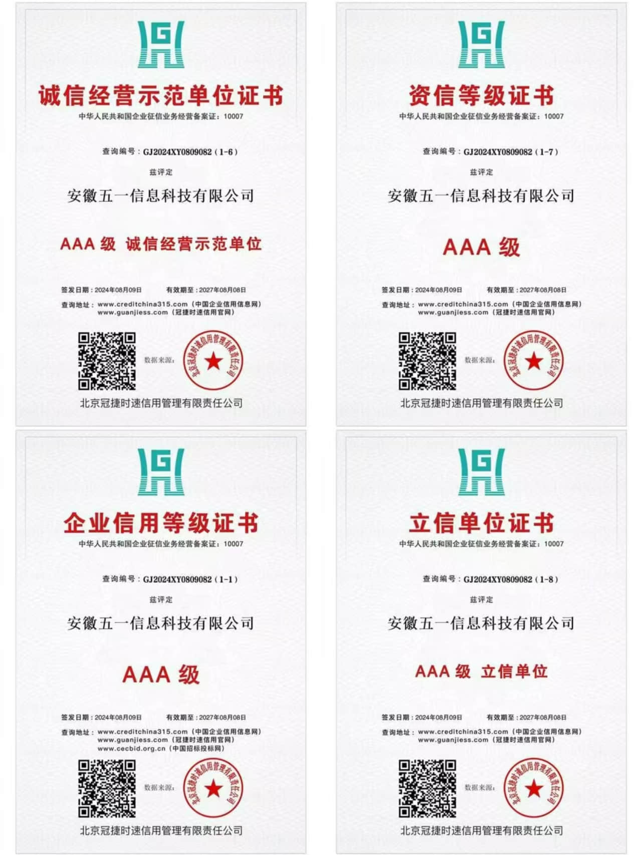 2024年8月27日,安徽五一信息科技有限公司荣获资信等级AAA的荣誉。