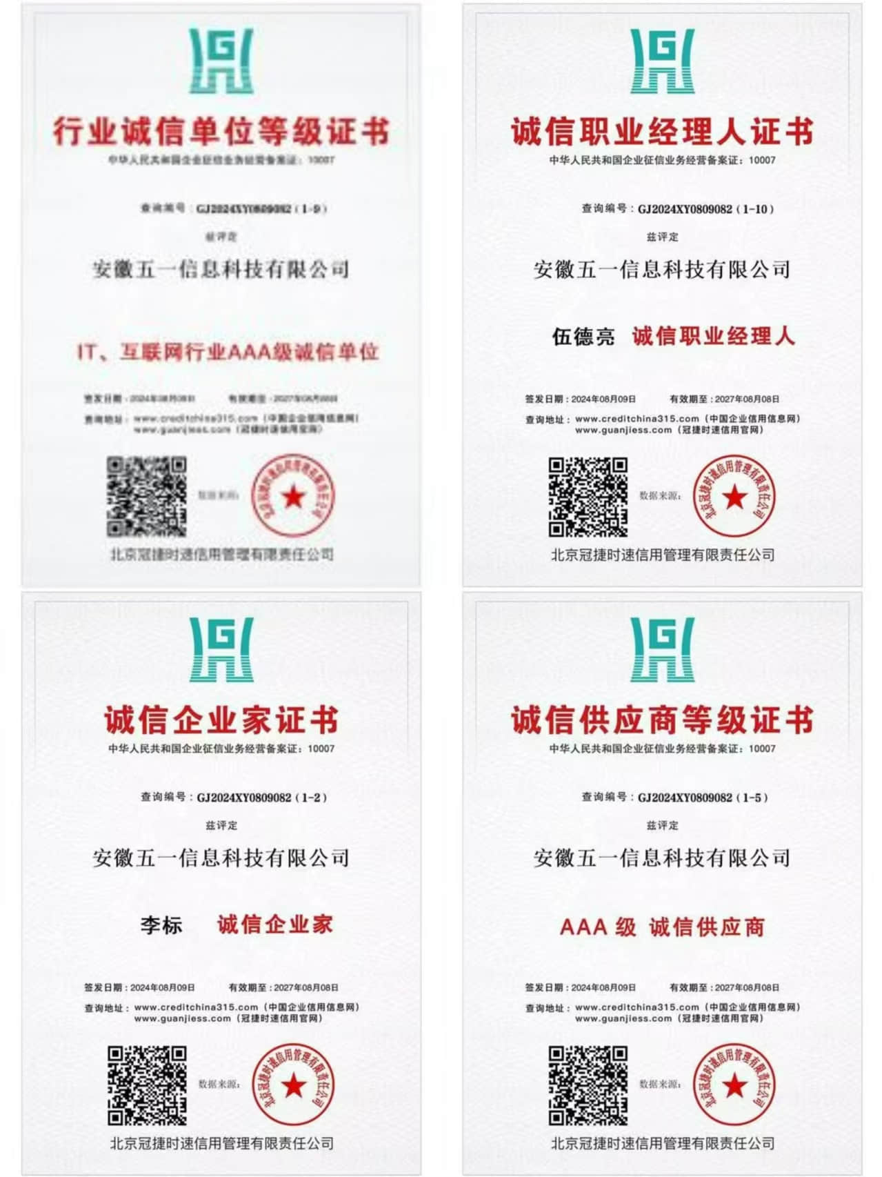 以下是安徽五一信息科技有限公司获得的荣誉资质的例子: